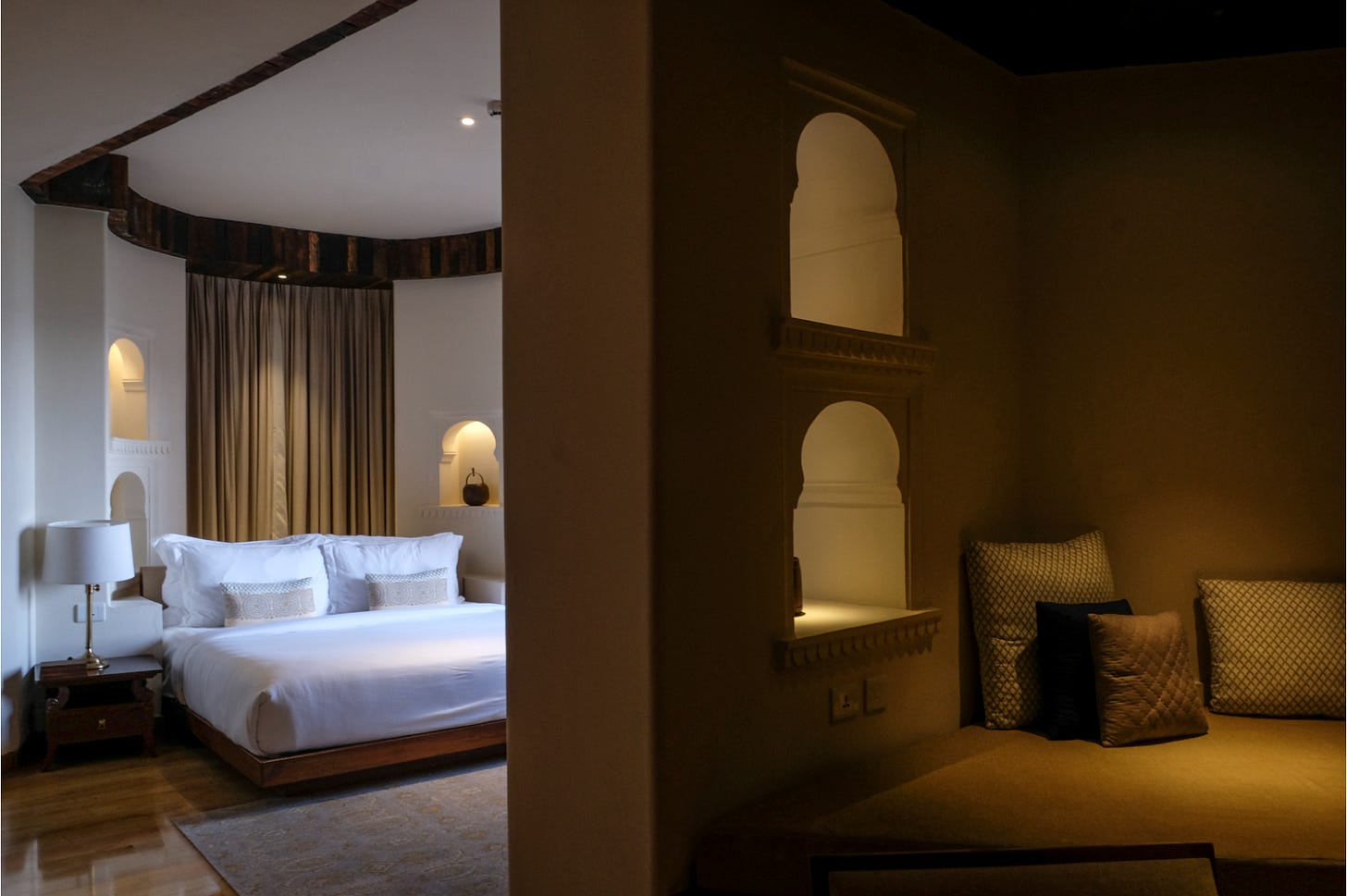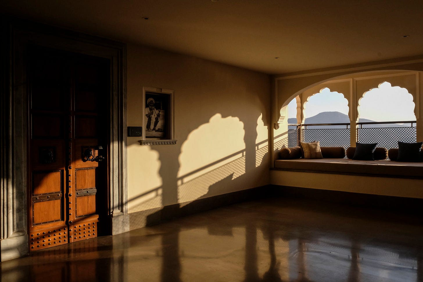 It took architects Sandeep and Ritu Khandelwal ten painstaking years to renovate the property and there are plenty of clues to how they worked within its limitations. The lifts go to different floors depending on whether you’re in the king’s or soldiers’ quarters of the building and its 59 rooms and suites have 22 different layouts across five categories. The constraints seem like a highlight rather than hindrance. The architects preserved original details such as arched windows and latticed jalis, celebrated natural curves, and designed the interiors to complement, striking a careful balance between old and new, restoration and construction.
